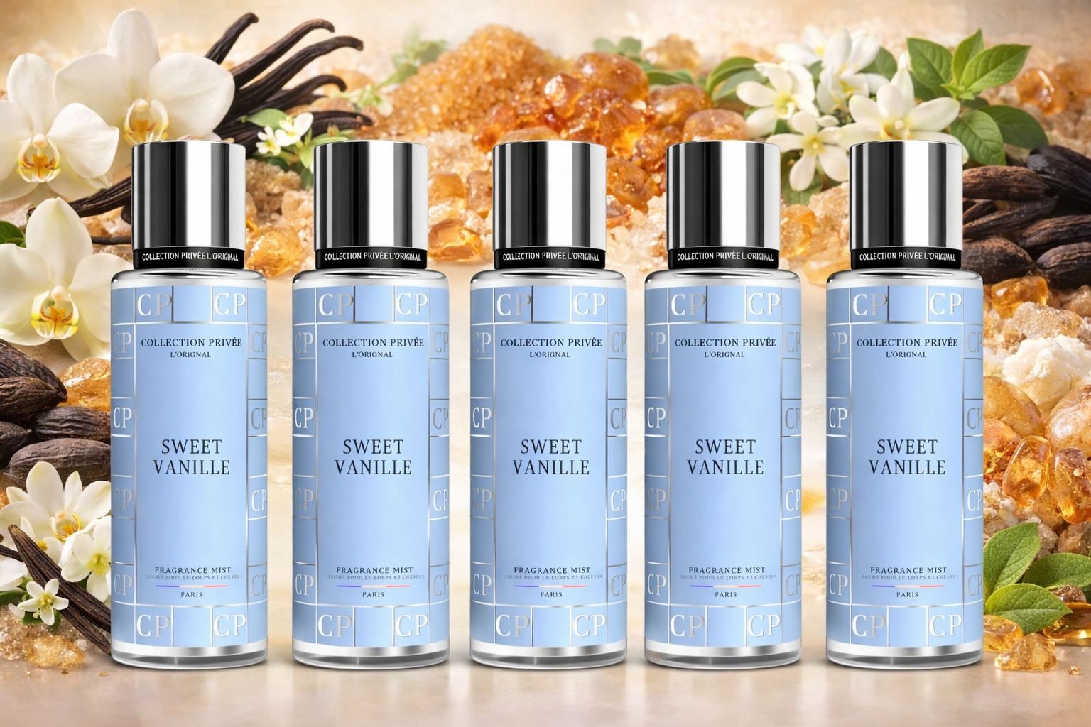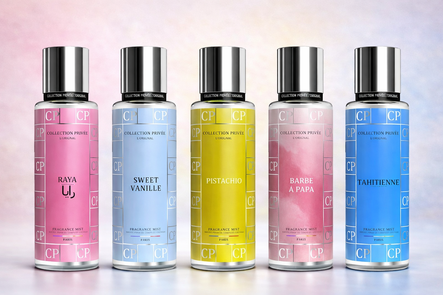Découvrez notre lot de brumes corps et cheveux signé Collection Privée L'Original Paris. Fabriquées en France, ces brumes parfumées de 250 ml parfument délicatement la peau et les cheveux avec des fragrances légères et raffinées, idéales pour une utilisation quotidienne.
